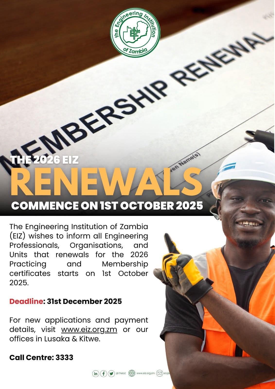 The Engineering Institution of Zambia (EIZ) is pleased to announce the official commencement of renewals for the 2026 Practicing and Membership Certificates, effective 1st October 2025. This annual renewal process is a critical step in maintaining professional standards and ensuring compliance across the engineering sector.