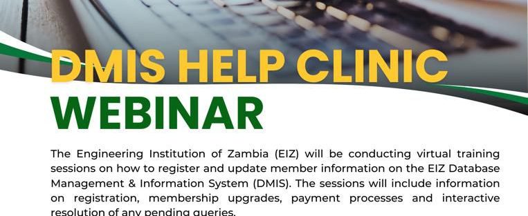 The DMIS Help Clinic Webinar is a free virtual training initiative organized by the Engineering Institution of Zambia (EIZ) to support its members in effectively using the EIZ Database Management and Information System (DMIS). The webinar is designed to provide clear, step-by-step guidance on how to register on the DMIS platform, update and manage personal member information, process membership upgrades, and complete payments correctly. In addition to training, the sessions offer an interactive help clinic environment where participants can raise questions and receive assistance in resolving any outstanding or pending issues related to their EIZ membership records. The webinar is scheduled to run across multiple Thursdays between January and March 2026, with sessions held at both 13:00 hours and 18:00 hours, allowing flexibility for members to attend at a convenient time. Overall, the DMIS Help Clinic Webinar aims to improve member compliance, data accuracy, and ease of engagement with EIZ’s digital systems.