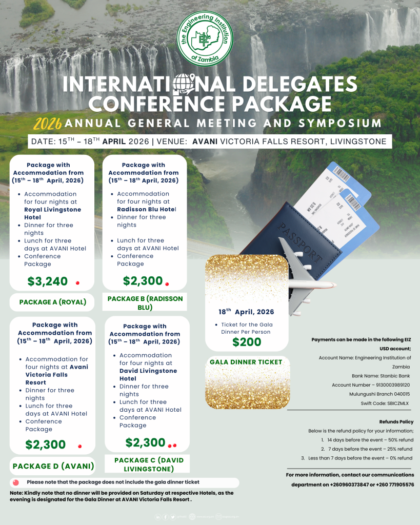 The Engineering Institution of Zambia (EIZ) has introduced a dedicated International Delegates Conference Package for the 2026 Annual General Meeting (AGM) and Symposium, taking place from 15th to 18th April 2026 in Livingstone, Zambia, at the Avani Victoria Falls Resort.